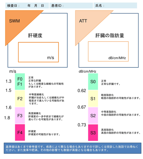 超音波の伝搬過程で生じる減衰より減衰係数を計測し、肝臓の脂肪化の程度を非侵襲的に推定することができます。計測はワンボタンでSWMと同時に行われるため、簡便な操作で行えます。